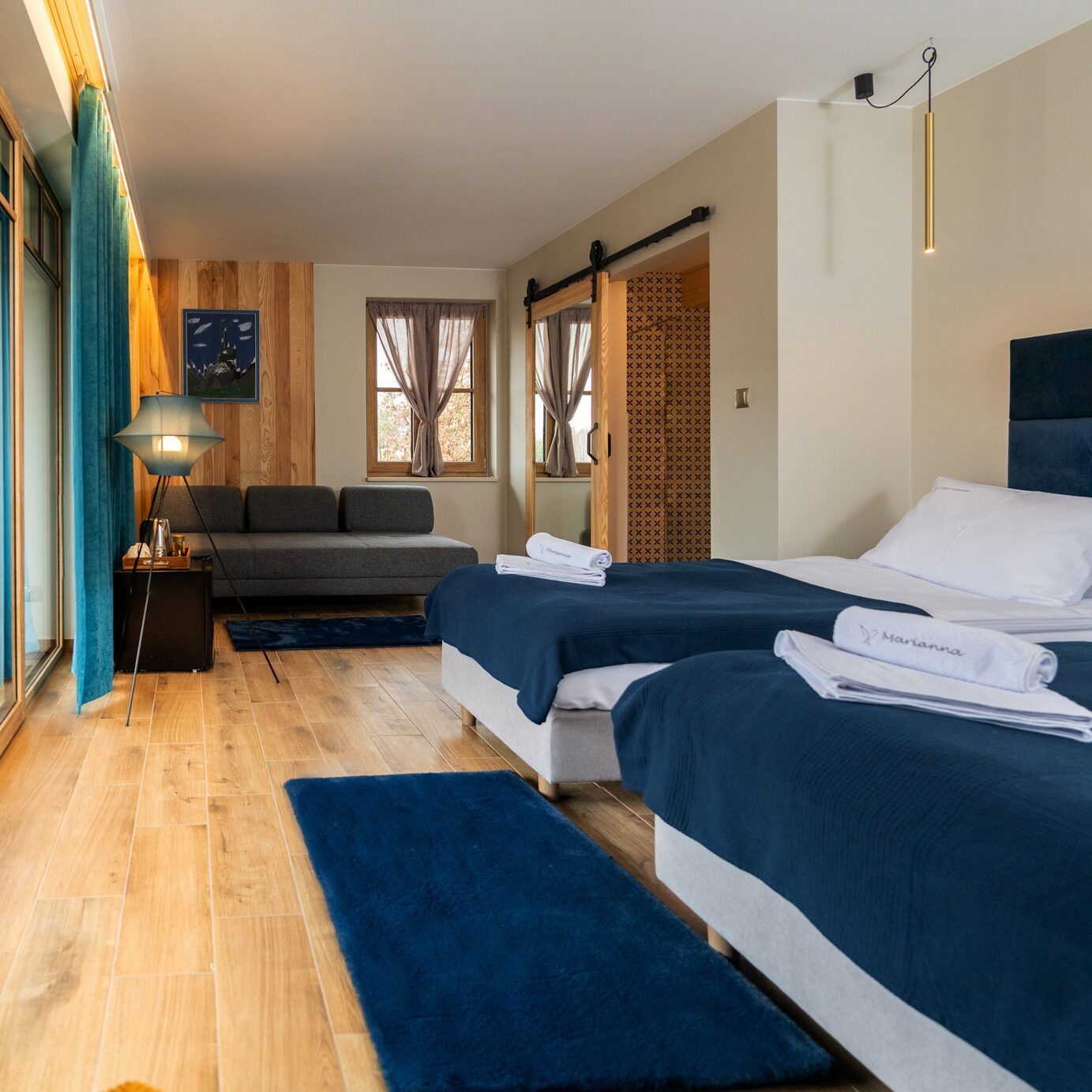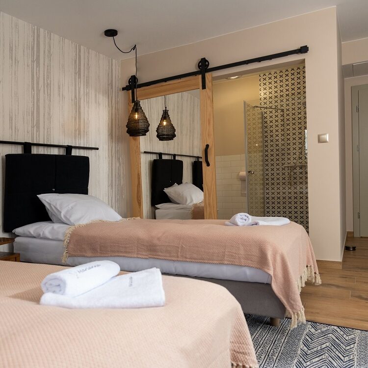Mieszkamy w klimatycznych, 2 i 3-osobowych, z których rozciąga się piękny widok na okoliczne łąki i lasy. Każdy pokój ma prywatną łazienkę, wyposażoną w ręczniki i suszarkę. Do naszej dyspozycji jest też salonik na piętrze i sauna.